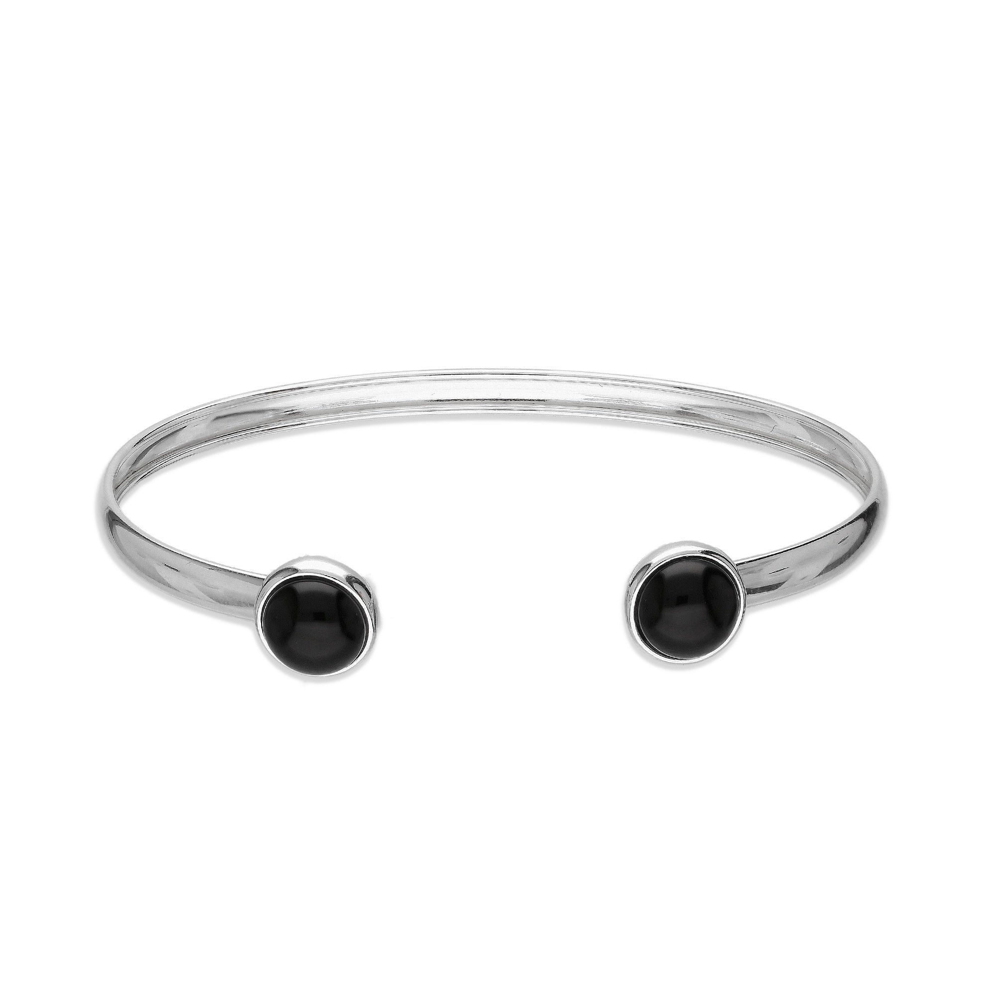 This lightweight bangle design made for flexibility and comfort with the slimline sterling silver frame with a handpicked Whitby Jet cabochon placed on each end, perfect for everyday wear.