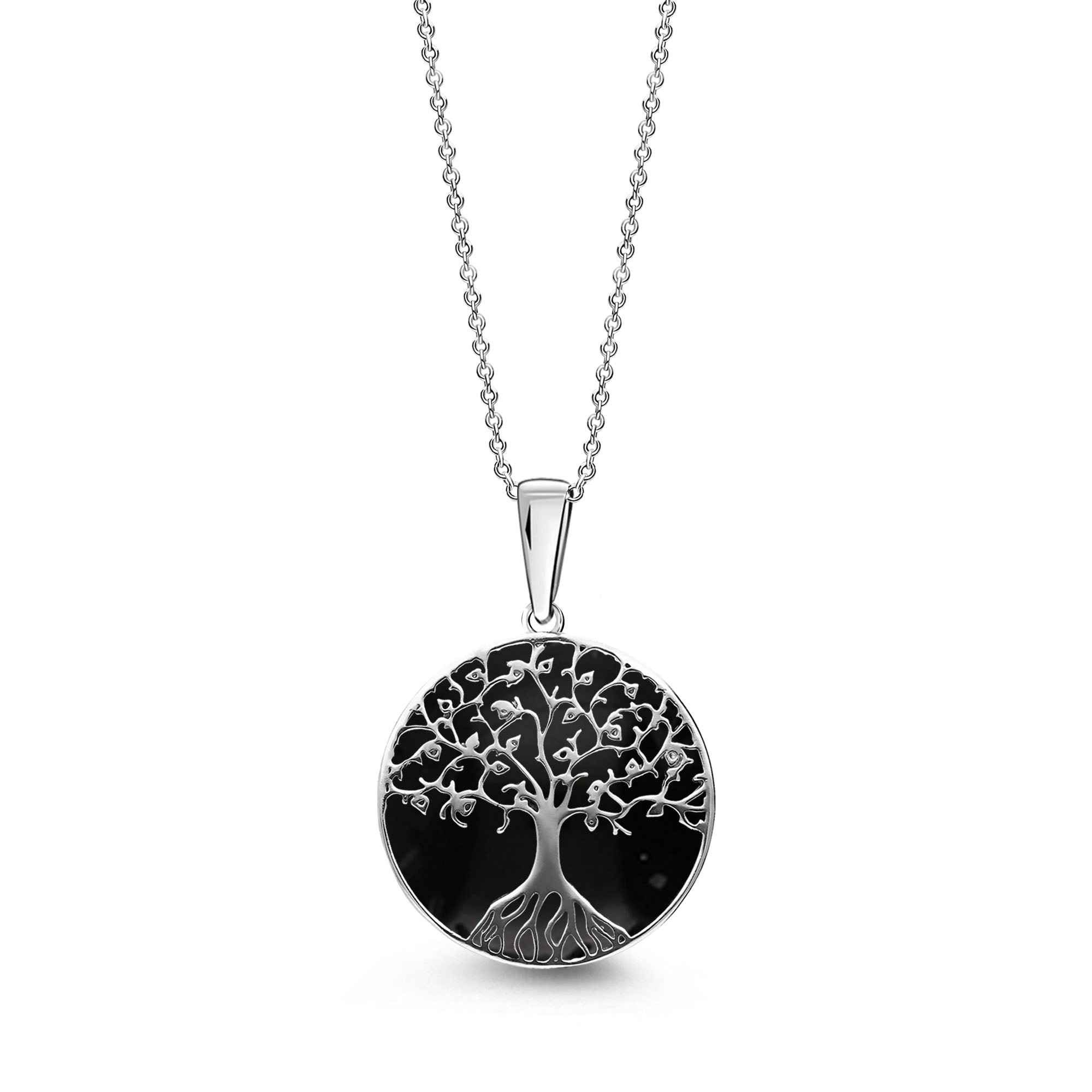 This stunning Sterling silver Tree of life pendant boasts a bold cabochon of genuine Whitby Jet set behind the Trunk and branches of this highly detailed design.