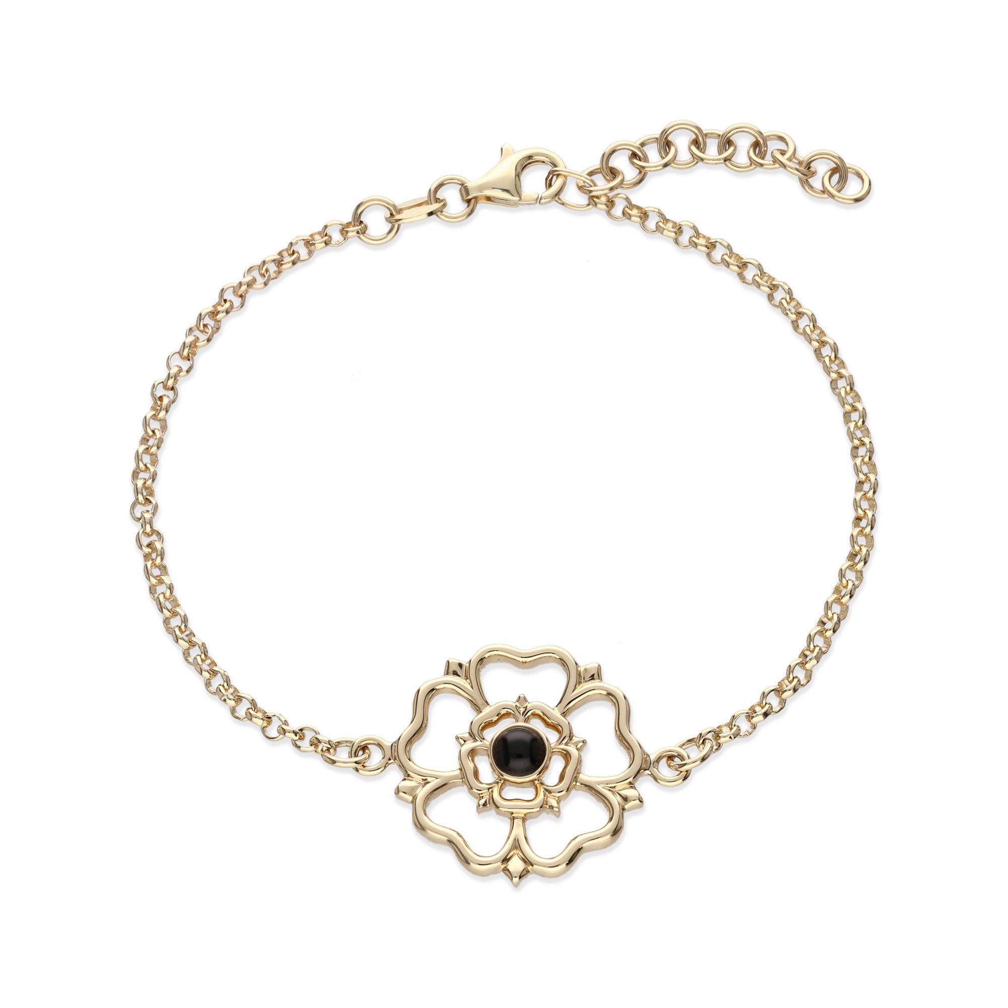 This stunning Yorkshire Rose Bracelet features a highly detailed 9ct Yellow Gold rose design which is complimented perfectly by a hand-carved Whitby Jet Gemstone. A perfect gift for any Yorkshire lover, loud & proud. Complete with a lobster catch for added security.